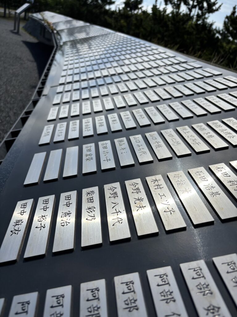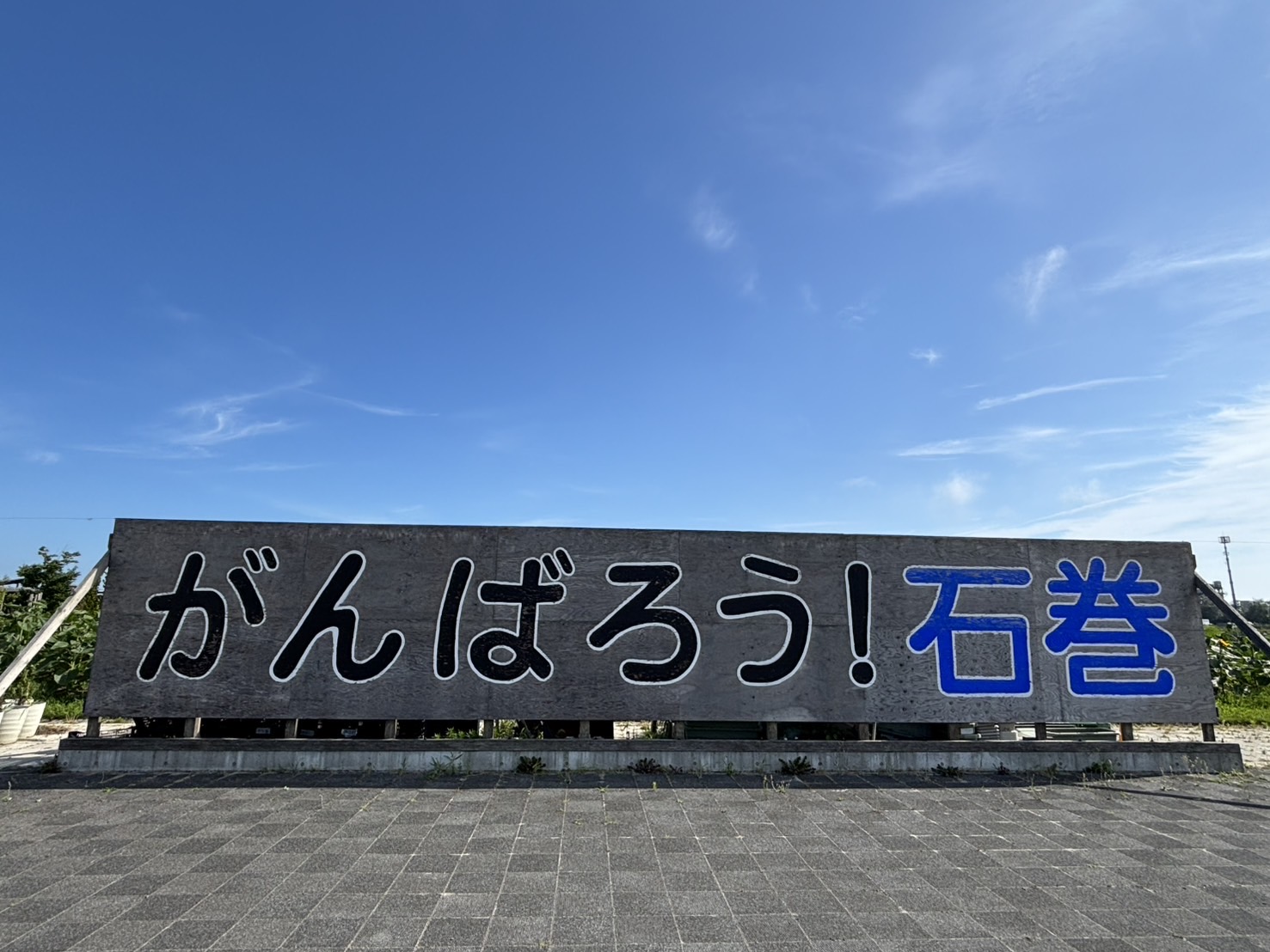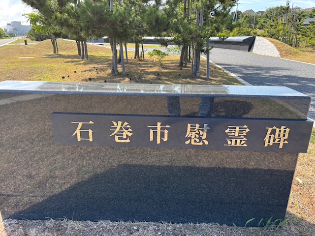 *石巻南浜津波復興祈念公園内にある慰霊碑、がんばろう!石巻の看板