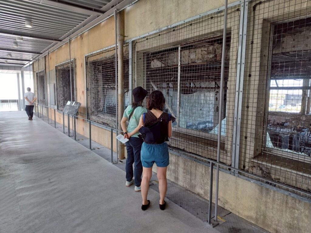 震災遺構と一言で言っても各施設やその土地(地形)で状況は様々です。こちらの門脇小は、”津波”と”津波火災”の被災状況を残している全国唯一の震災遺構。海から約1キロの門脇小は大震災で高さ約1・8メートルの津波に襲われ、さらに流れてきた家などから引火し校舎はほぼ全焼しました。校内にいた児童224名と教職員の方は避難をして無事でしたが、すでに下校していた7名が津波の犠牲になりました。
