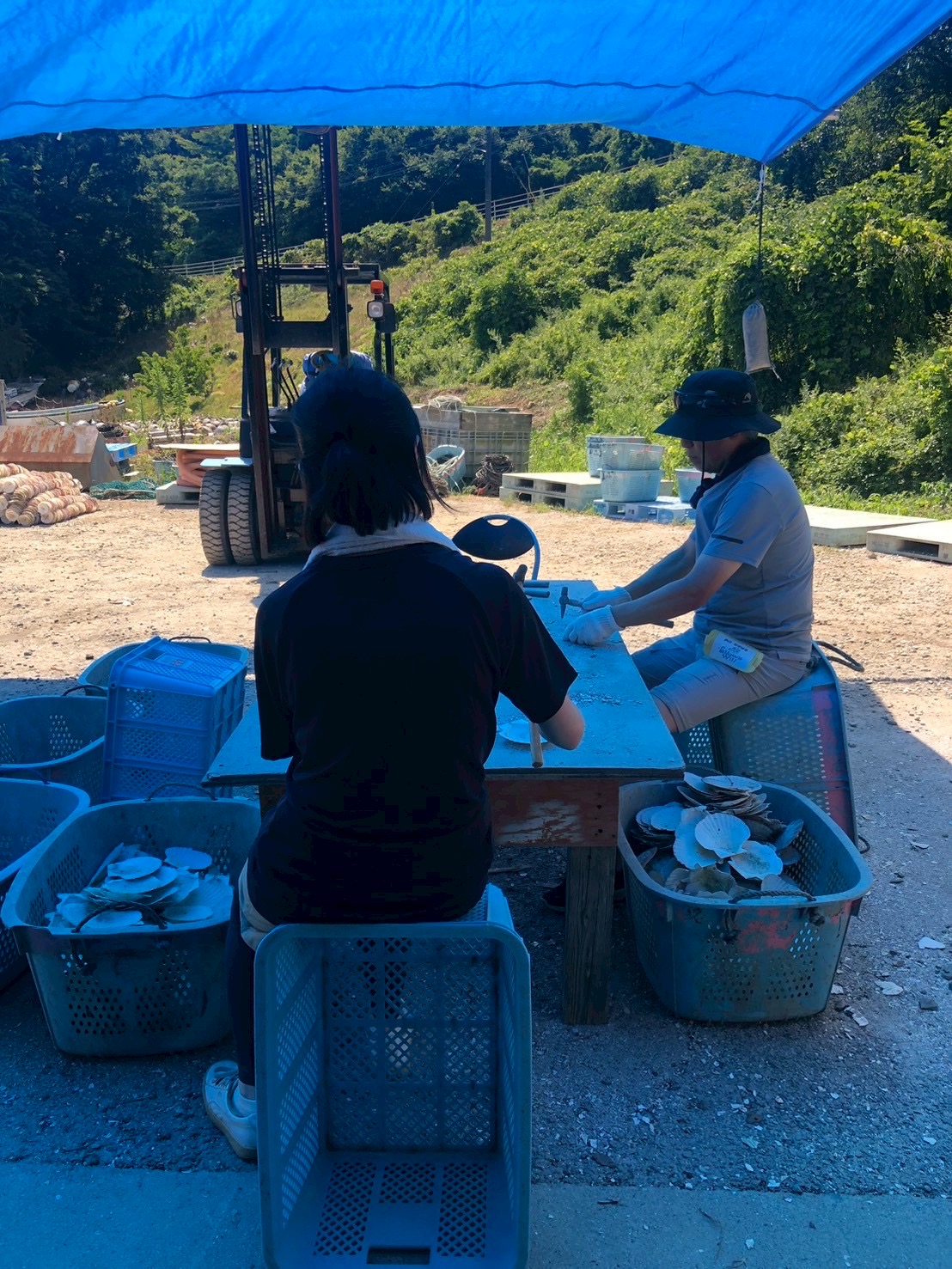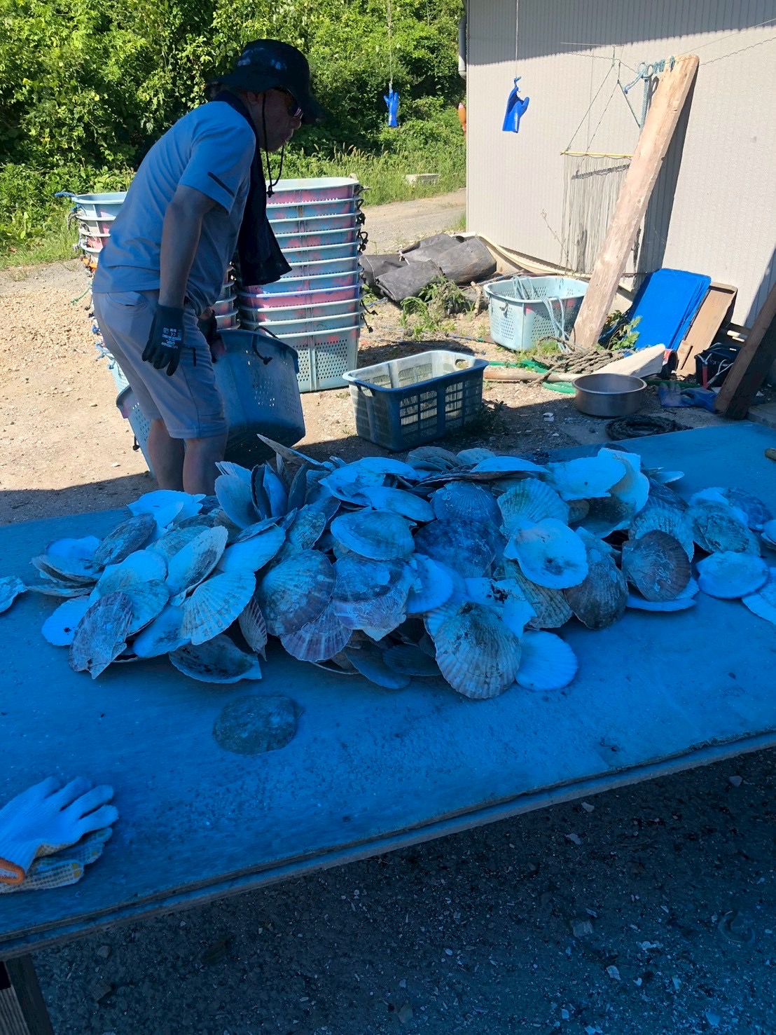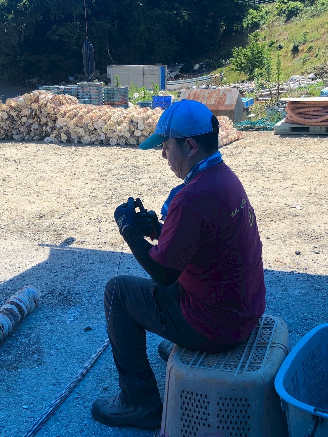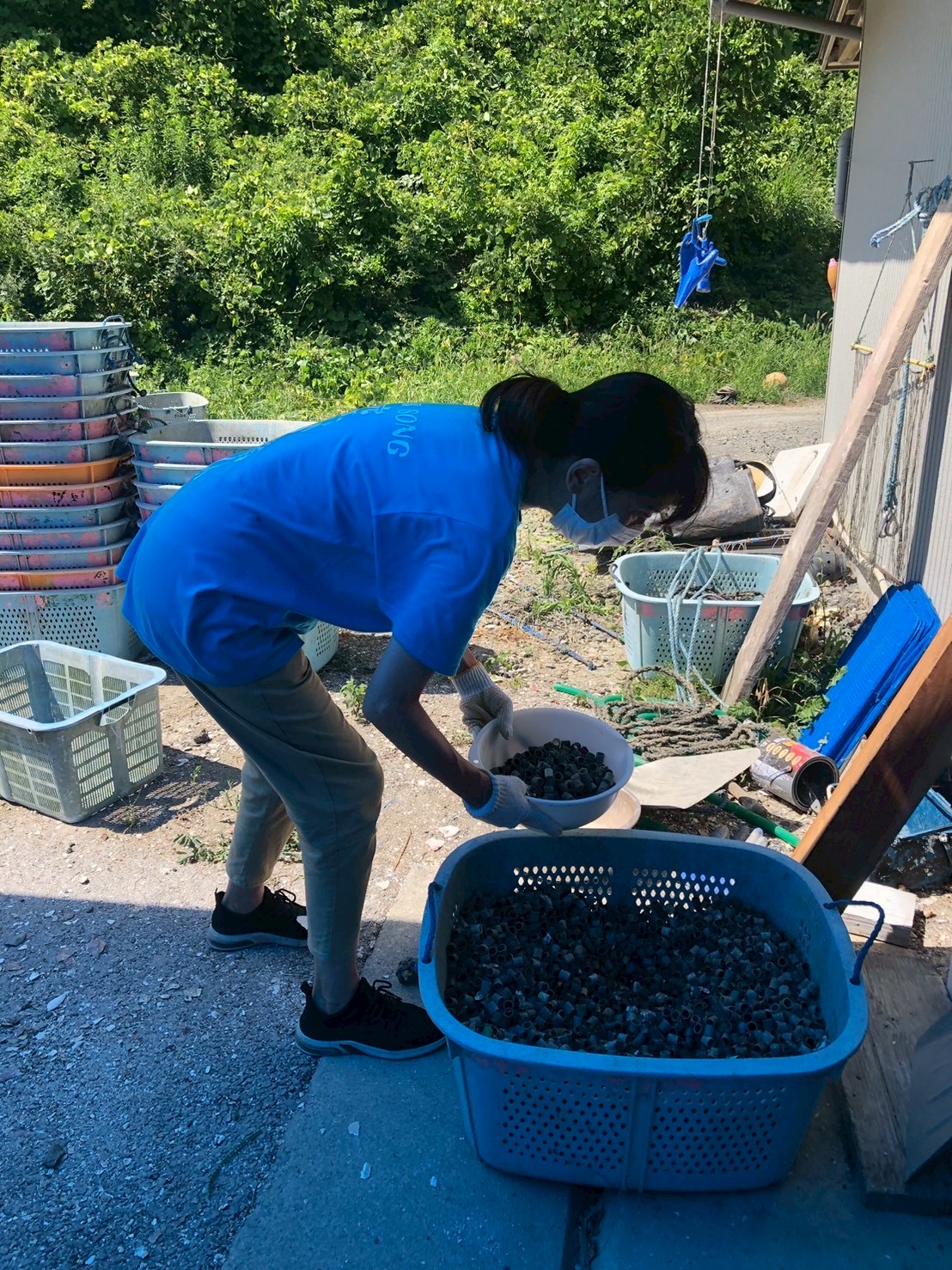 今回のボランティアツアーの3日目は、海岸清掃など別のスケジュールも検討していたのですが、原盤づくりに使うホタテ貝殻が万丈(ばんじょう)かごに山のように積んであり、これはボランティアツアー中に1つでも多く原盤を仕上げなければ!と参加者さん・スタッフ皆同じ思いで3日目も戸倉でホタテ原盤づくり作業となりました。阿部さんご夫婦は無理せずにお願いしますねと仰っていましたが、これからも続く暑さのことを考えますと、せっかくボランティアツアーでおじゃましているのですから少しでもお役に立ちたいという思いです。