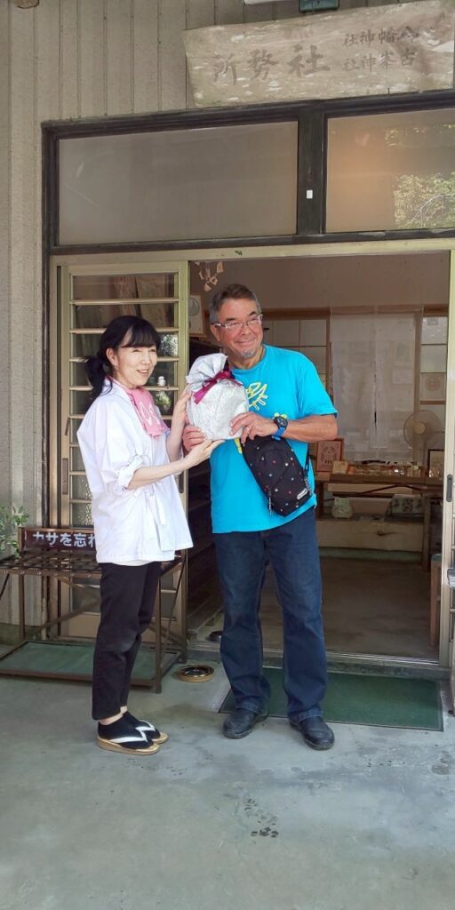 禰宜の工藤さんより今回のツアーで一区切り(卒業)するフェローズウィルの代表に贈り物贈呈式(卒業証書授与?)がおこなわれました。