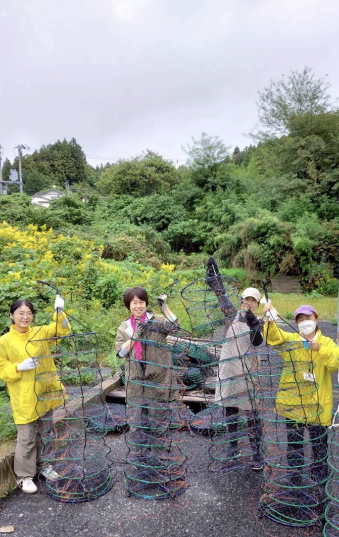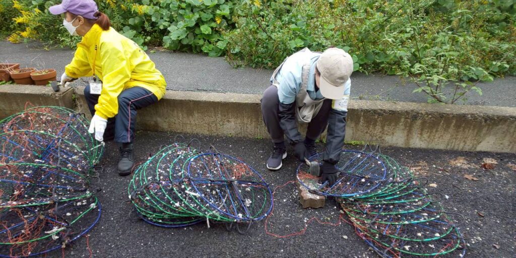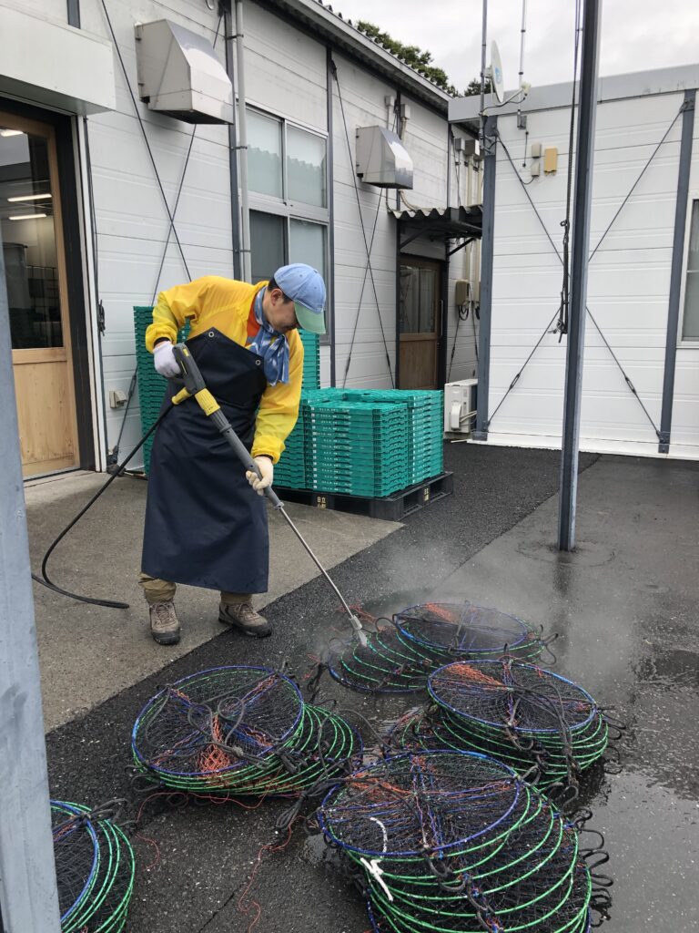 禰宜の工藤さんにご挨拶をして、ワイナリー作業に向かいます。出発時間もあるのであまり作業時間が有りませんが、出来る限りお手伝いしたいと思います。昨年も行った海中にワインを沈める際に使うカゴ掃除を行います。カゴについたフジツボや貝などをある程度手作業で取り除き、あとは水圧で一気に落としていきます。このカゴを用いて約8か月間、志津川湾の海中で熟成させるワインは熟成が早まり、よりまろやかな旨みが出てタンニンなども穏やかになり美味しいそうです。皆さんぜひ南三陸ワイナリーさんのサイトをのぞいてみてくださいね。