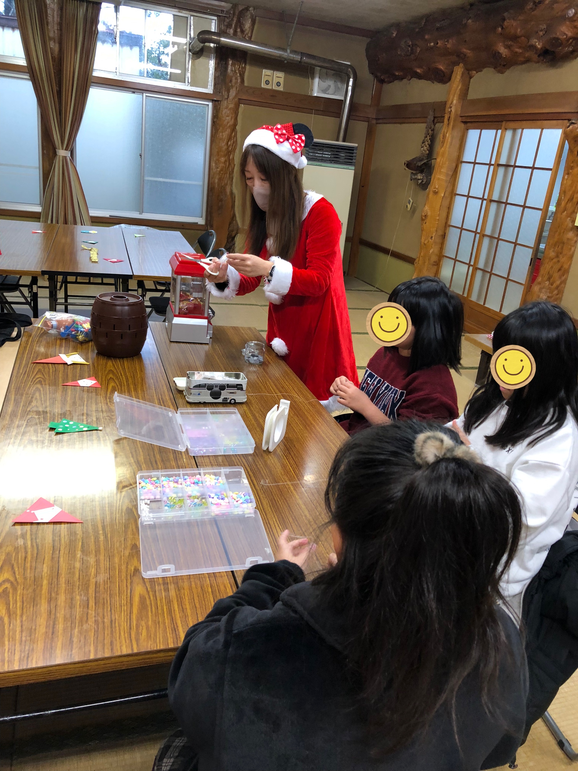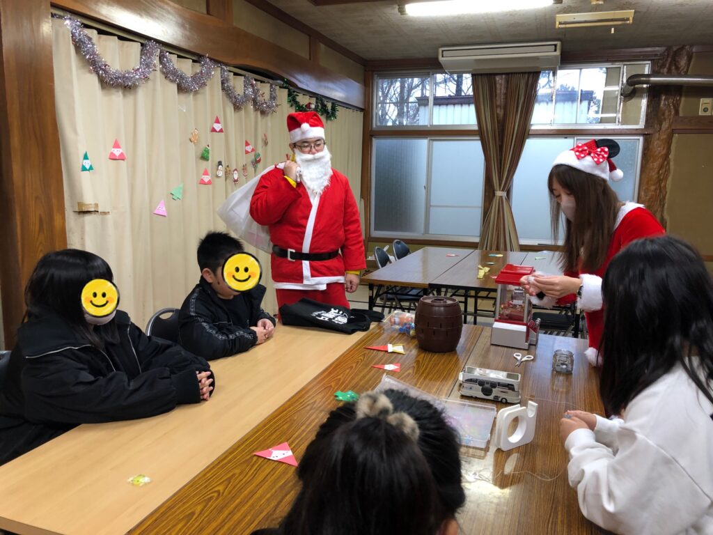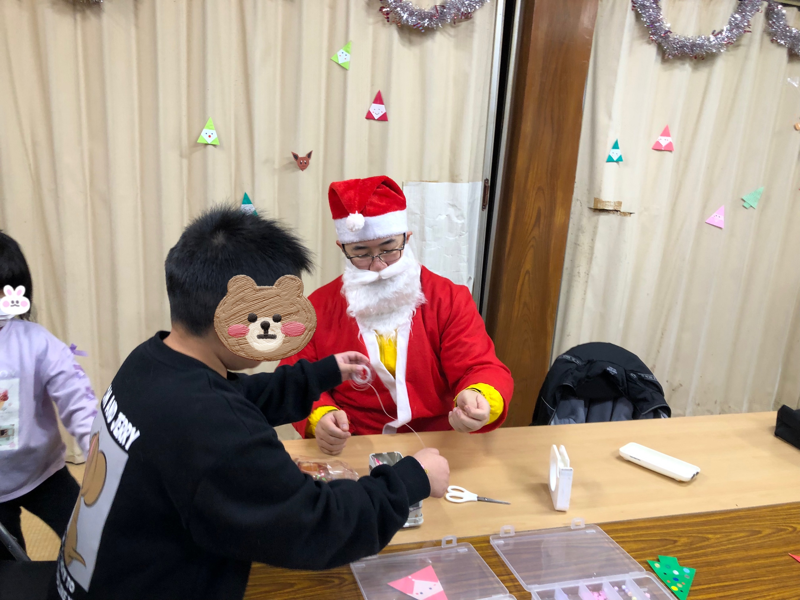 お渡し会開始の9時になりました。この天候だと来るのはちょっと難しいかなと話していたところ足元の悪い中、生徒さんたちが来てくださいました。皆で楽しめるように先生がゲームやアクセサリー作づくりを用意して下さっています。ゲームに夢中な生徒さんたち。さて、サンタさんはどこに・・・。