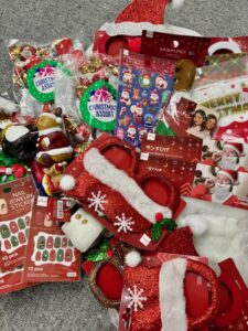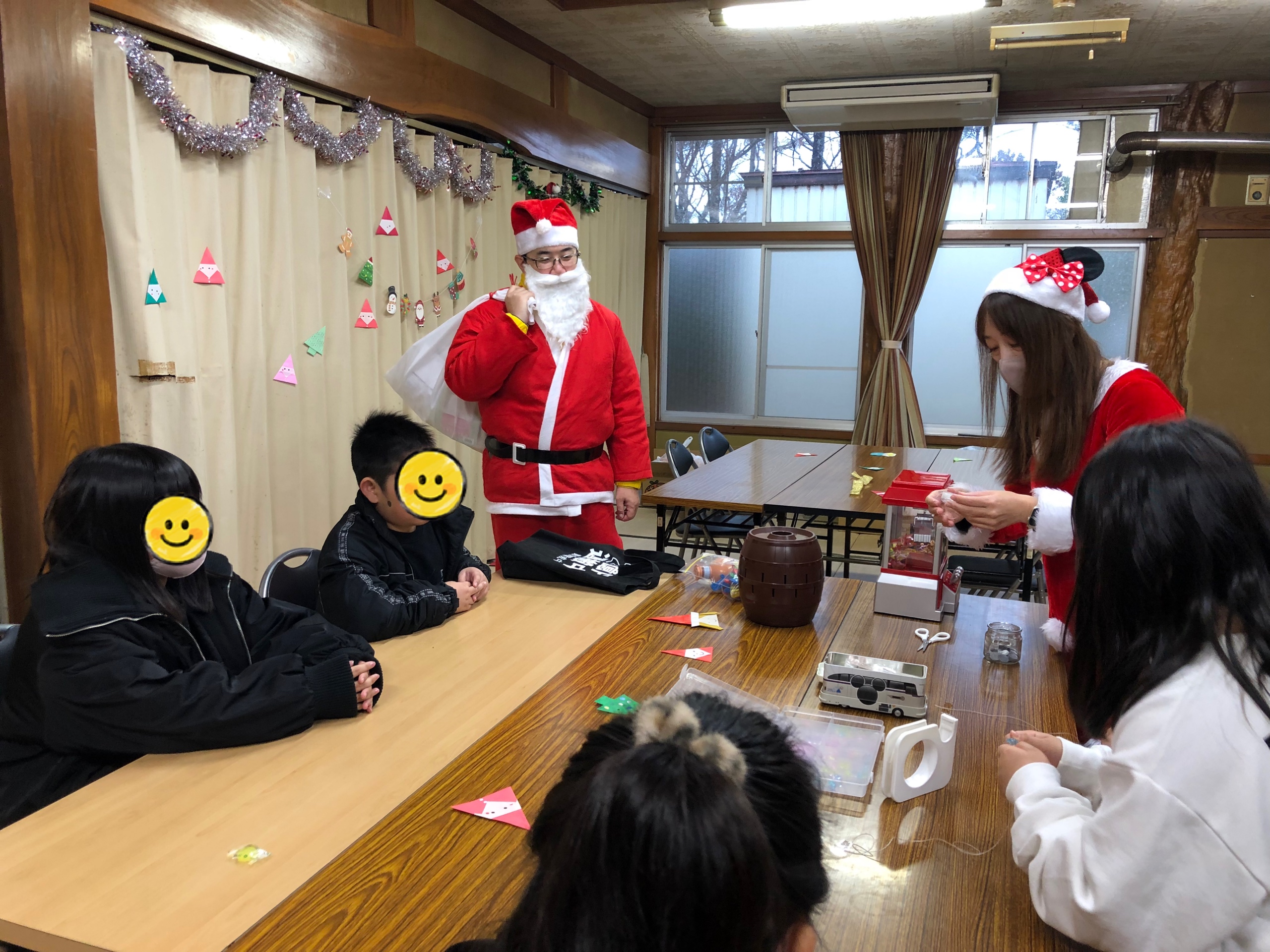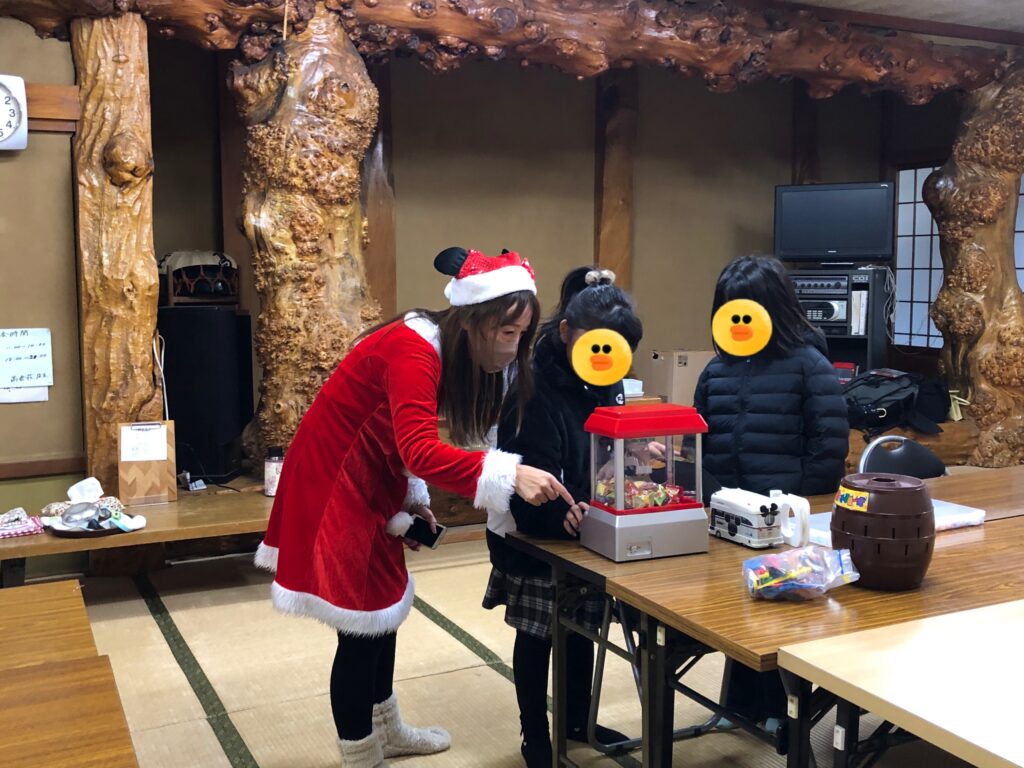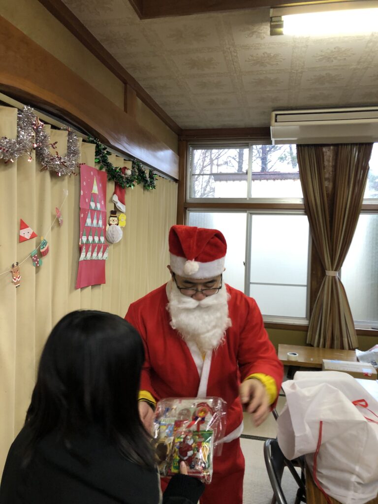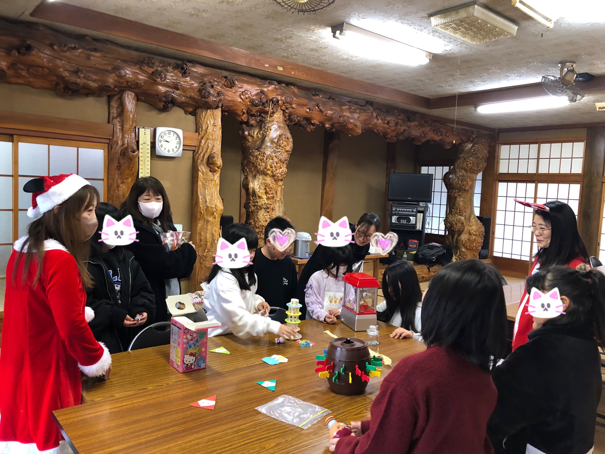 お渡し会開始の9時になりました。この天候だと来るのはちょっと難しいかなと話していたところ足元の悪い中、生徒さんたちが来てくださいました。皆で楽しめるように先生がゲームやアクセサリー作づくりを用意して下さっています。ゲームに夢中な生徒さんたち。さて、サンタさんはどこに・・・。